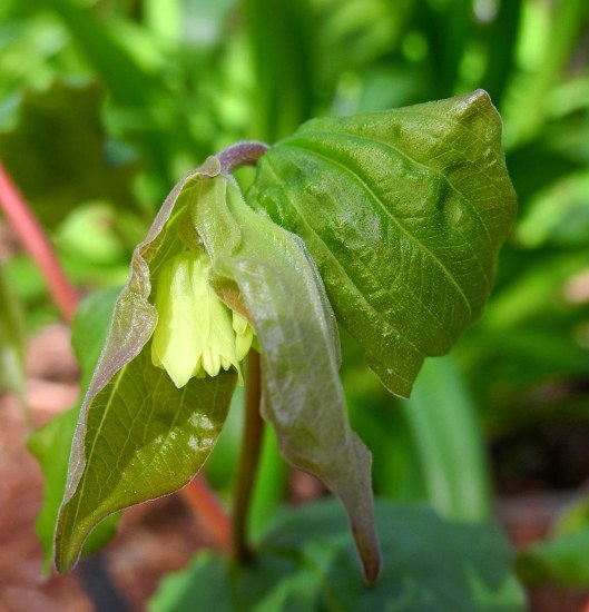 Prosartes lanuginosa (Michx.) D. Don, synonym Disporum lanuginosum (Michx.) G.Nicholson, and commonly known as yellow mandarin or yellow fairybells, occurs in the Great Smoky Mountains and in many other parts of the Appalachian region from New York to Alabama. It has greenish yellow bell shaped unspotted flowers arranged singly or in pairs at the end of the branches followed by smooth red berries. The leaves are slightly hairy and prominently veined. Height range: 1-3 ft.