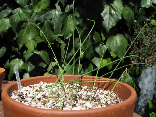 Pseudogaltonia clavata (Baker ex Mast.) E.Phillips is from the summer rainfall region of Namibia. It produces huge bulbs that look like coconuts. Flowers are white and funnel-shaped. According to Harry Hay who grows this in England, his plants took 21 years from seed before they flowered. Seeds can be treated like any other flat-seeded amaryllids. They germinate easily with warm temperatures. Plants should be grown warm when possible. In the San Francisco Bay Area, the outdoor summer is not warm enough to break winter dormancy for these plants. In order to break their dormancy, water the bulbs and keep them on a warm and sunny windowsill. Once they have broken dormancy, they can be grown outdoors. Keep them well watered with occasional fertilizers throughout the growing season. Keep the medium near completely dry during winter dormancy. Height range: to about 1.3 m.