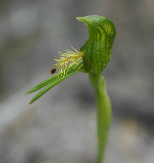 Pterostylis tasmanica D.L.Jones grows on heathland and heathy forest in well-drained soils in New Zealand, New South Wales, Victoria, South Australia and Tasmania. It is similar to Pterostylis plumosa but has smaller flowers and long yellow hairs on the lip. The flower is about 2.5 cm long with the upper hooded part translucent with a netted pattern of dark green lines. This species was included in Plumatichilos with other bearded Greenhoods as Plumatichilos tasmanicus (D.L.Jones) Szlach., but in 2025 that is considered to be a synonym. Height range: to about 18 cm. Photos were taken by Bob Rutemoeller and Mary Sue Ittner October 2007 near Apollo Bay where it was growing in heathland.