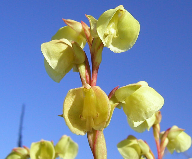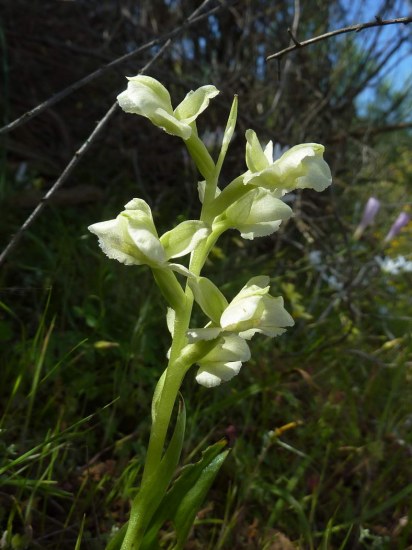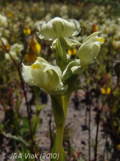 Pterygodium alatum (Thunb.) Sw., syn. Ophrys alata Thunb., is found in scrub, sandy flats, and slopes in a widespread area of South Africa (Clanwilliam to Humansdorp) at an elevation of 30 to 900 m. Growing from 7 to 15 cm high, plants have spreading leaves clustered at the base, often dry at flowering, and a few densely clustered pale greenish yellow fragrant flowers with a lip with 2 broad diverging lobes. Plants flower August to October, mostly after fire. Plants can occur in large numbers, but usually only in seasonally moist soils. Photos from the book Plants of the Klein Karoo courtesy of Jan and Anne Lise Schutte-Vlok.