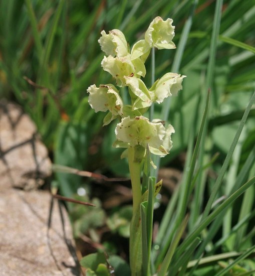 Pterygodium platypetalum Lindl., commonly called flat bonnet, is found on sandstone mountain slopes, often on ledges or on shallow soils in the Western Cape. It grows to 24 cm and has 1 to2 pale yellowish-green flowers. The photo was taken by Mary Sue Ittner near Bainskloof.
