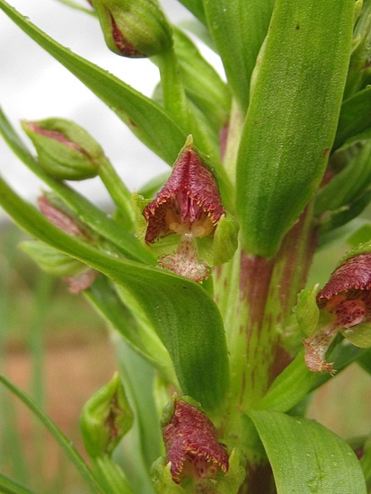 Pterygodium magnum Rchb.f. is a summer rainfall species found in marshy grassland on floodplains at 900 to 1800 m from the Eastern Cape to Mpumalanga. Growing up to 1.5 m with flowers crowded in a large dense spike, it flowers January through May. The petals are greenish yellow spotted or streaked red-purple with a white to pale green or mauve fringed lip mottled purple. Photos taken by Cameron McMaster in KwaZulu-Natal and the Eastern Cape.