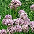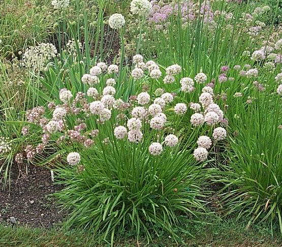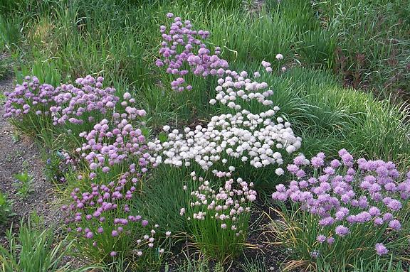 Photos by Mark McDonough show different forms. In the first photo we see a semi-dwarf form, growing 10-12" (25-30 cm) tall, with informal jostled heads of lilac-purple. In the second there is a garden view showing an array of color forms from white, through shades of pink and mauve. The last photo from Mark McDonough is of a form that was grown from seed of chives wild collected in Corsica. This was a very dwarf form, growing only 6-8" (15-20 cm) tall, with much sparser, very narrow foliage, slender stems and adorable little clusters of bloom in many colors. Subsequent seedling progeny has led to some very good selected forms. The photo shows a plant in the rock garden near Seattle, Washington.