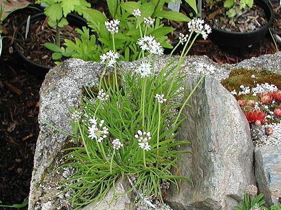 Allium albidum ssp. caucasicum (Regel) Stearn is a nice compact form of this European mat-forming onion. The small white flowers in July and August are not particularly large, showy, or plentiful, but it's a pleasant enough little species that makes carpets of fine green strap-shaped foliage. It's small enough to grow in a trough, as shown in the image. Photos by Mark McDonough.