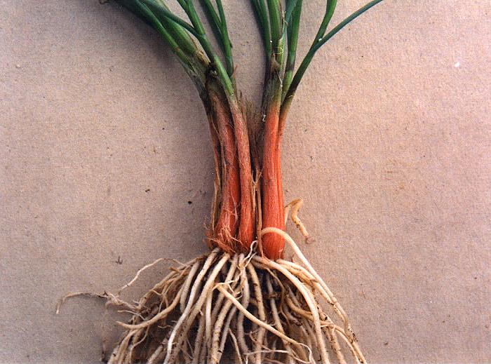 Allium przewalskianum Regel is a delightful small species from Central Asia to China, with very fine terete foliage, good-sized balls of rose-purple flowers, and distinctive fibrous orange-colored bulb bases. The second photo is a clear close-up up the cinnamon orange bulb bases and white roots. Height range: to about 40 cm. Photos by Mark McDonough.