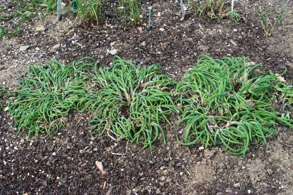 'Curly Mauve' is a hybrid that I named, being one of the better "curly types" and a fascinating plant on many accounts. Many forms of chives actually have prostrate foliage; this one starts out prostrate, later becoming a misty blue-gray dance of medusa whips curling in all directions. In June the stems stand erect above the short curled foliage to open a sea of grayed-lavender chive florets. The five photos below show a growth progression. The last photo is a "Curly Mauve seedling", a spontaneous garden seedling that caught my eye in early spring because of the octopus-like rosette, the blue-gray curled tentacles swirling around flat on the ground. Photos by Mark McDonough.