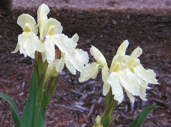 Roscoea × beesiana Cowley & C.Whitehouse is a hybrid between Roscoa auriculata and Roscoea cautleyoides that grows to about 40 cm. It has cream flowers, with the lip often streaked purple. Photos of plants flowering during January in Canberra by Lyn Edwards and Paul Tyerman.