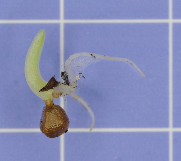 Roscoea cautleyoides Gagnep. is endemic to China, from Sichuan and Yunnan provinces, found growing in pine forests and meadows at 2000-3500 meters. Flower color can vary from yellow to purple, white, or pink. Stems reach 6"-24" (15-60 cm) tall, flowering before or with the leaves, from May-August, depending on the form. Photo 1 was taken by Rob Hamilton of plant flowering during November in Tasmania. Photo 2 was taken by Bob Rutemoeller at Wisley in the UK during May 2005. Photo 3 was taken by Nhu Nguyen at the Royal Botanic Garden at Edinburgh in August 2010. Photos 4-6 of seeds, a seedling (both on a 10 mm grid) and seedlings by David Pilling. Germination occurred after about three weeks exposure to moisture at 65 °F.