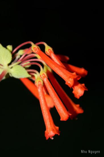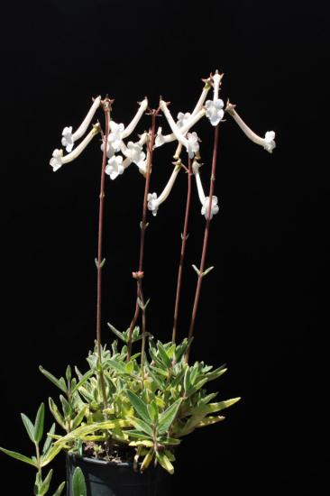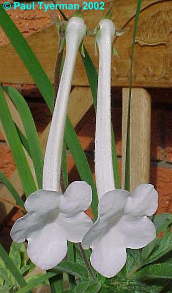 Sinningia tubiflora (Hook.) Fritsch is a lovely tuberous species that produces long tubular flowers with a lovely delicate sweet perfume, reminiscent of 'Froot Loops' cereal. In contrast to the lovely fragrant flowers, the foliage smells foul when bruised. The species is somewhat hardy and can survive to -6 °C frost in Canberra, Australia, and can be grown in sheltered areas of USDA zone 6. It can be grown very easily in the ground, going dormant each winter and then re-sprouting with blooms in early summer. Plant the tubers in an area that gets full sun and lots of heat. They do not seem to mind winter rainfall as long as the soil is well drained. The plants need a cool winter dormancy (lower than 15 °C) in order to flower the following year. In warm climates such as Honolulu, Hawai`i, this species remains evergreen and vigorous yet fails to reflower. It is probably best to allow the foliage to dry out before removing the stems from the plant. This species blooms in summer atop new growth that emerges in late spring (Uluwehi Knecht). It can produce a number of tubers and form nice colonies over time (John Ingram). Height range: 45-60 cm.