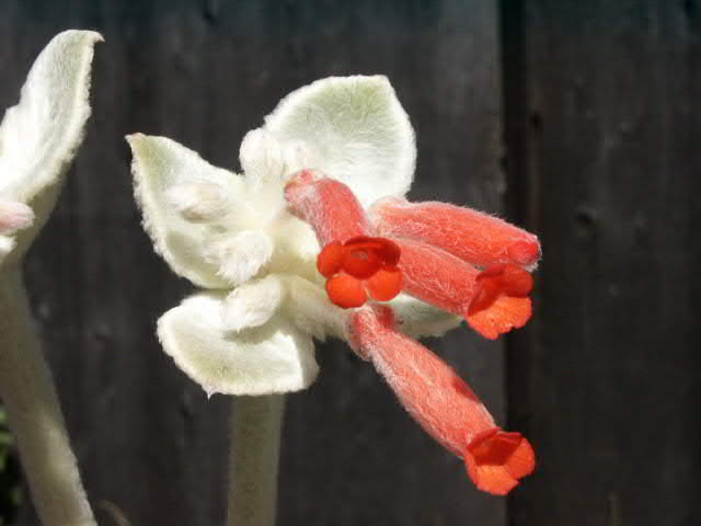 Sinningia leucotricha (Hoehne) H.E.Moore is a great garden plant for southern California and can be grown in full sun along the coast. This is one of the most common species grown, sometimes mistakenly sold as S. canescens. It does fine with afternoon shade elsewhere. The salmon color is great and the fuzzy white leaves are a treasure. It is quite often sold by succulent growers because of the exposed caudex which can be quite attractive. The flowers are a beautiful salmon and open before the leaves are fully formed. These small leaves will expand over a month or so to reach 6-8" long. Height range: 20-30 cm. The first photo was taken by John Ingram and the next two by Bill Dijk. The third picture was taken three weeks after the second.