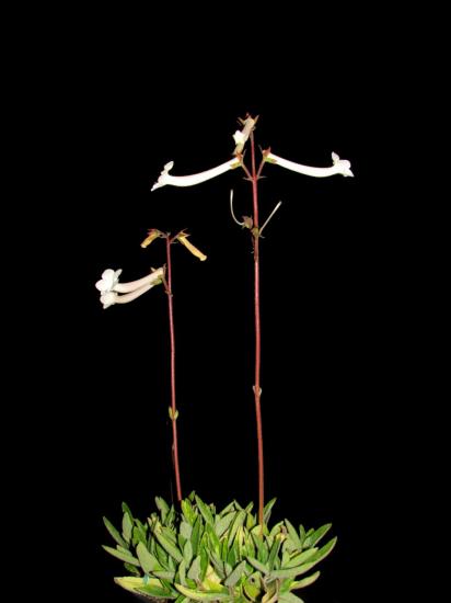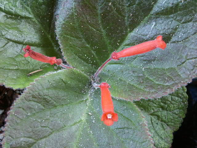 Sinningia ramboi G.E.Ferreira, Waechter & Chautems is native to Southern Brazil where it grows on exposed cliffs at higher elevations. During its dormant period it needs cold temperatures (probably 4 to 6 weeks near freezing) in order for flower buds to set. When the plant resumes growth, the flower buds emerge immediately. Height: to about 20 cm. Photos from Dennis Kramb who after 7 years of growing it, learned what it needed to flower.