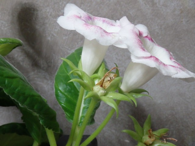 Sinningia leopoldii (Scheidw. ex Planch.) Chautems is native to the Atlantic forest in Santa Catarina State, Brazil. Height range: to about 30 cm. The photos below were taken by Nhu Nguyen. Photos 4-5 show flowers that have unusual side growths, even though the same plant (in photos 1-3) didn't produce these growths the year before.