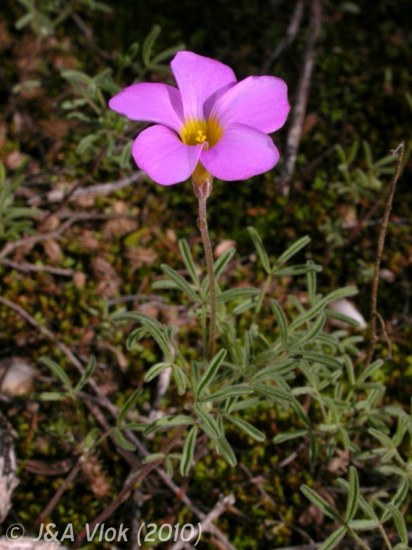 Oxalis ciliaris Jacq. is a widespread species that occurs from the Northwest and Southwest Cape to the Eastern Cape (Tulbagh to Port Elizabeth). Growing up to 30 cm, but usually shorter, in colonies, plants have a distinct stem at the base with occasional leaves on the stem. Leaves are trifoliate, terminally clustered with hairs on the midribs. They are usually folded along the middle. There is only 1 flower per stalk ranging in color from white, pink, rose, violet or salmon with a dark yellow tube. Plants flower in autumn and winter (April to July). Photo from the book Plants of the Klein Karoo courtesy of Jan and Anne Lise Schutte-Vlok.