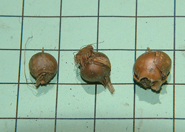 Romulea subfistulosa M.P.de Vos grows on dolerite flats from Calvinia to the Roggeveld Escarpment. It is pink with dark blotches at the edge of a yellow cup. Height: 15-30 cm. The first one shown below is grown by Alan Horstmann in South Africa, photographed by Bob Rutemoeller and the next two photos are from Bob Werra. The last photo taken by Mary Sue Ittner shows corms on a 1 cm grid. The smaller ones are two years old.