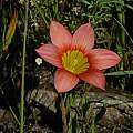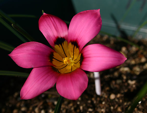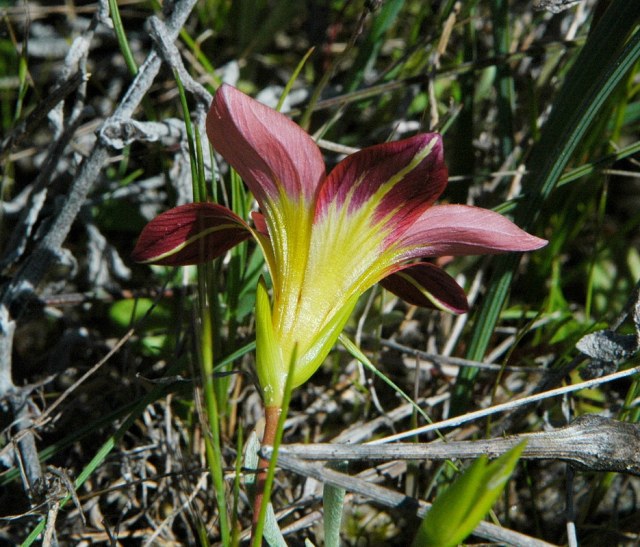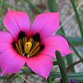 Romulea pudica (Sol. ex Ker Gawl.) Baker. Formerly known as Romulea amoena Schltr. ex Bég., this species grows in damp sandstone soils in the Bokkeveld Mountains (northwest Cape.) It has deep rose pink to red flowers with black blotches and stripes in a yellow or cream cup, arranged in a very striking star-shaped pattern. The old name means "beautiful;" the new name means "chaste," which just goes to show you that botany isn't poetry. Height: 15-30 cm. For details on the renaming, see the article by Goldblatt, Manning, and Harrower in Bothalia 41,2: 269–276 (2011).