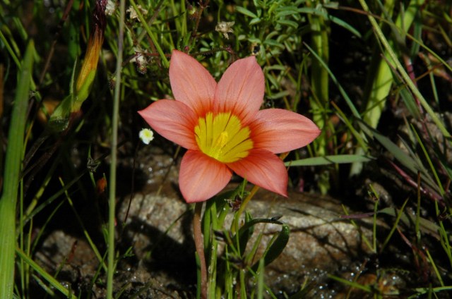 Romulea sladenii M.P.de Vos is restricted to the Gifberg and Matsikamma Mountains in the Northwest Cape, where it grows on rocky seasonally wet sandstone flats and shallow soil. Plants are 7 to 30 cm with a subterranean stem that branches above ground and can reach 20 cm. The white unscented flowers have an orange-yellow cup; the outer tepals are flushed green or pink on the reverse. This species has bright yellow partly exserted anthers and can be distinguished from another Giftberg Romulea species, Romulea toximontana, by the color of the anthers and the different corms. Romulea sladenii corms are symmetrical, bell-shaped, with a broad, lacerated basal ridge and Romulea toximontana has laterally compressed, oblique corms with a wide basal ridge. Flowering is in late winter to spring (August to September). Photos below were taken by Mary Sue Ittner including the corms on a 1 cm grid.