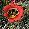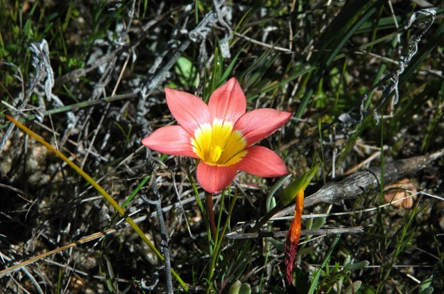 Romulea pilosa J.C.Manning & Goldblatt has an orange or red flower with a large yellow center, sometimes banded in white. The species is known from two locations near Riviersonderend, where it grows in a rare plant community known as Rûens Silcrete Renosterveld. The leaves are winged and very hairy at the edges, an adaptation that may help the plant gather light while reducing evaporation. This plant was first collected in the 1930s, and then was apparently lost until rediscovered in 2009 by PBS members Cameron McMaster and Rhoda McMaster. Height range: 10-30 cm. Photos by the McMasters.
