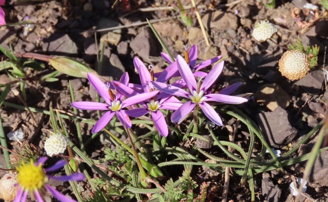 A form with much smaller flowers that sets seed profusely once considered to be var. australis (Ewart) M.P.de Vos when varieties were recognized, is a terrible weed in Australia and also has achieved weedy status in northern California. The first two pictures below show naturalized populations in Australia, the second of them in the Grampians. The third shows it blooming in coastal Sonoma County, California, where it was viewed in alarmingly large numbers. What I believe to be this weedy form received in a NARGS seed exchange, misidentified as something else, is pictured in the last three photos with close-ups of the flowers so it can be recognized and avoided in areas where it might escape and be a problem. Photos by Mary Sue Ittner.