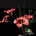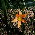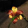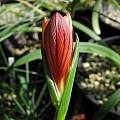 Romulea sp. This Romulea was grown from Silverhill seed called Romulea namaquensis. It was collected in Namaqualand, but does not fit the description of that species and may instead be a new unnamed species. I have had poor luck growing these no doubt because they are unhappy in my much wetter climate. Of the original 11 seeds that germinated fall 2001, only two corms have survived. One gorgeous flower bloomed in 2006. There are two basal leaves and two stem leaves. When closed the flower looked red. The flower only opened late in the day. Perhaps it wasn't warm enough although it was a period of warmer than usual weather for this time of the year. Flowers originally looked almost gold, but on later days became salmon and then orange when open with reddish lines in the throat of the flower. Photos show the stages as the flower slowly opened and on subsequent days. Photos by Mary Sue Ittner