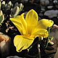 Romulea sphaerocarpa M.P.de Vos is found sporadically in moist sites in fynbos and renosterveld and on sandstone outcrops in the inland mountains in the Northwest Cape and the Little Karoo. Growing from 15 to 30 cm high, it has an obliquely flattened corm with a wide fan-shaped basal ridge, one, rarely two, sticky (often attracting sand grains) basal leaves and usually solitary yellow flowers with brown streaks in the cup. It flowers in winter (June). Photo from the book Plants of the Klein Karoo courtesy of Jan and Anne Lise Schutte-Vlok.