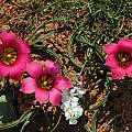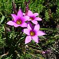 Romulea rosea (L.) Eckl. is found on sandy and clay slopes and flats and is widespread in many different geographical areas of the Cape. It is also very variable and once was considered to have five different varieties. It grows from 6 to 15 cm, occasionally to 60 cm, and has a corm that is rounded at the base with curved acuminate teeth. Leaves are 3 to 6, basal and narrowly four-grooved. Flowers are pink to magenta or white, often with a purplish zone around the yellow cup. The fruiting peduncles curve after flowering and straighten later. Photos by Alan Horstmann and Mary Sue Ittner of larger forms, front and back, plants with white flowers, and corms on a 1 cm grid.