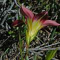 Romulea pratensis M.P.de Vos grows in grassland in the southeastern Cape. From 12 to 25 cm tall, this species has a corm with an oblique basal ridge and sharply bent over fibrils. Flowers are white, lilac, or rose, often with 1-3 dark lines in the throat, and with a greenish yellow cup. Outer segments are brownish purple or green with dark lines on the backs. Photos were taken by Cameron McMaster in the Eastern Cape.