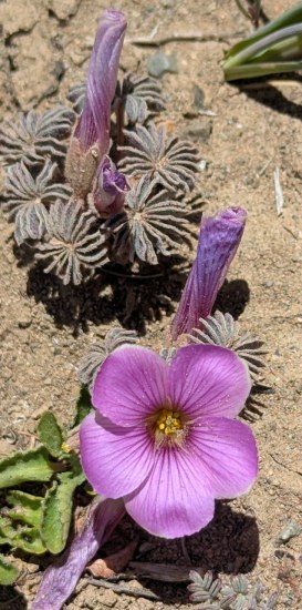 Oxalis spp. Chile the photos below are of species seen and photographed in late September and early October 2011 by Eugene Zielinski in Chile of the flowering desert. Some of them are probably tuberous. The first two photos show an interesting species with fuzzy flowering stems, photographed near Taltal. Photo 3 is of a very small species at the Pichasca National Monument. In photo 4 a plant is growing with an Eriosyce cactus. You can see the tubers in this photo. The last plant was growing in the Paposo area. The stick to the left of the flowers is actually the plant's trunk. This Oxalis is probably not a geophyte.