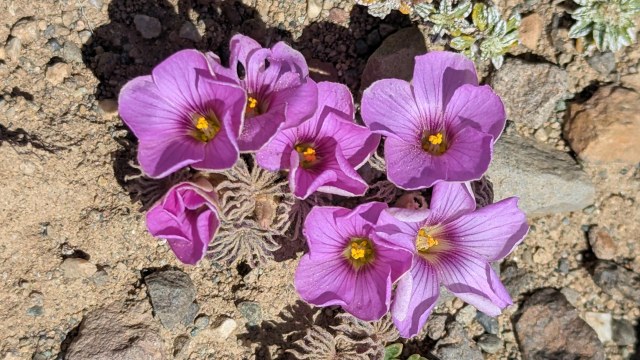 Oxalis morronei Alicia López & Múlgura grows in the shelter of rocks, in rocky and sandy soils, on slopes with a western exposure in southern Argentina (Santa Cruz, Patagonia). It belongs to Oxalis section Palmatifoliae. It grows from a subterranean rhizome composed of storage scale leaves and leaflets and has pink to violet solitary flowers. It differs from other species in this section by having square leaflets that are dented at the tip with margins that are wavy and fringed with fine hairs. More information and illustrations can be found here. Habitat photos were taken by Laura Grant in Argentina, in the vicinity of Monte Zeballos, Patagonia. She also includes a photo of the rhizome.