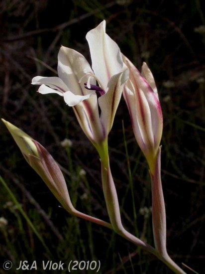 Photos below from the book Plants of the Klein Karoo courtesy of Jan and Anne Lise Schutte-Vlok who write that this species grows up to 60 cm tall with broad grey green leaves. It can be confused with Gladiolus grandiflorus which has a shorter tube.