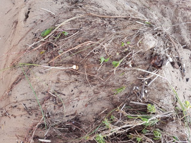 In September 2023 "We have had extreme storm surges associated with Spring equinox tides which has stripped the coast of sand exposing the bulbs. This shows the white stem indicating that the bulbs are between 200 and 300 mm below the surface. In my experiences this is very deep for gladioli bulbs, it is possibly to prevent dehydration on the dunes. At least 70 % of the bulbs have been washed away in this one incident".