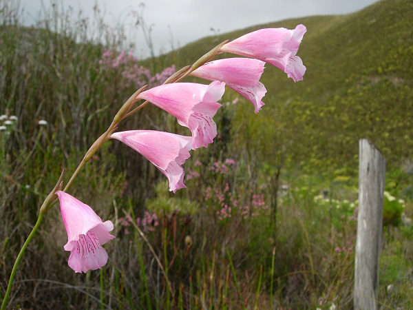Gladiolus geardii L.Bolus (syn. Gladiolus robustus Goldblatt) is a late spring to summer bloomer (November to January) found on moist sandstone slopes in the southeastern Cape where it gets limited rainfall year round with a bit less in summer. Growing from 80 to 150 cm high, it is described as having sword shaped leaves and pink flowers with darker markings on the lower tepals in a 6 to 10 flowered spike. The dorsal tepal is inclined. In cultivation in a Mediterranean climate, it is not dormant long. The first photo was taken by Rachel Saunders near Port Elizabeth where some very tall plants were in flower December 2013. One had 7 branches and 14 open flowers. The next two photos were taken by Bob Rutemoeller and the last three by Mary Sue Ittner.