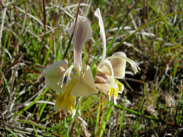 Gladiolus wilsonii (Baker) Goldblatt & J.C.Manning grows in the Eastern Cape which is a summer rainfall area, but it flowers in spring with the leaves (October to November) after scant autumn and winter rainfall. It grows in open grassland in light loamy sand. It has short tubed white to cream fragrant flowers. Sometimes the reverse of the upper tepals is flushed pink to purple toward the tips and sometimes the lower three tepals have a short pale mauve streak near the base. Height range: 20-40 cm. The first two photos by Cameron McMaster. The last three photos were taken January 2010 near Maclear in the Eastern Cape by Bob Rutemoeller and Mary Sue Ittner. Originally identified as Gladiolus inandensis which is very similar, it has now been identified as this species since the other species flowers July into August and flowers with the dry leaves from the previous season.