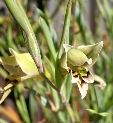 Gladiolus viridiflorus G.J.Lewis grows on rocky sandstone slopes in the northwest Cape. The first photo was taken by Sheila Burrow of a plant flowering exactly one year from sowing. The second photo from Rachel Saunders was taken near the Pakhuis Pass. Although it grows in many areas, it is small (10-20 cm) and difficult to see and not very common.