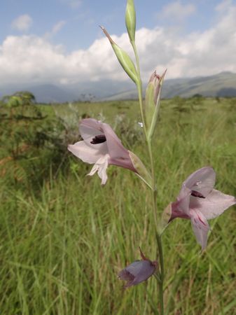 Gladiolus woodii Baker grows in grassland, on rocky hillsides from 800 to 2000 m in the summer rainfall area of South Africa from KwaZulu-Natal to the Limpopo Province. Mostly found in high elevation and high rainfall areas, it flowers early in the season, soon after it rains (from September to December). Leaves are often short and sheath the stem. Flowers are variable in color, pale yellow or lilac, oyster colored, dark maroon or red-brown with or without a longitudinal dark brown to purple stripe along the midline of the lower tepals and faintly to not scented. The upper tepals are much larger than the lower tepals and the lower laterals are folded. Height range: 20-45 cm. Photo from Rod Saunders.