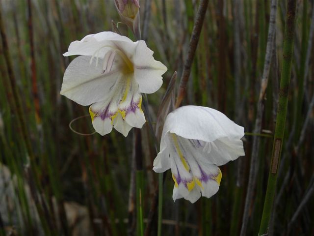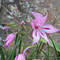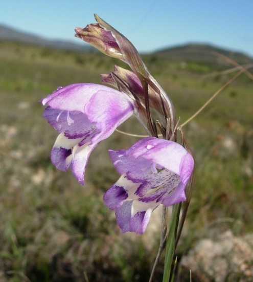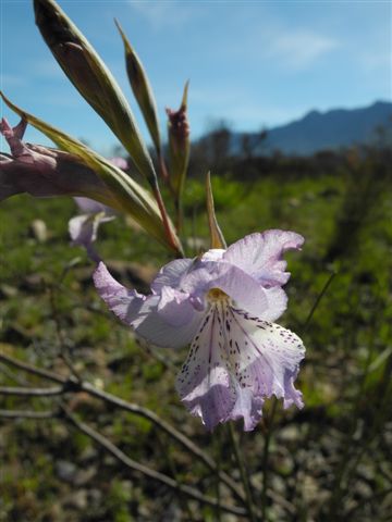 Gladiolus mostertiae is found in wet sandy soils in the Bokkeveld Mountains in the Northwest Cape. Growing 25 to 30 cm high, this species has linear leaves with a thickened midrib and pale pink flowers with yellow-green markings on the lower tepals. It flowers November to December. Photo taken by Rachel Saunders November 2013 near Nieuwoudtville in a year with late rainfall so the soil was still wet when it bloomed.