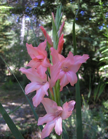 Gladiolus oppositiflorus Herb. is found in the southern part of the summer rainfall area where it grows in open grasslands and often in rocky sites where there is some protection from predators. Flowers are salmon to pale pink or mauve, with the lower three tepals paler in the midline and having a reddish to purple median streak. Height range: 60-160 cm. This species blooms summer into fall. The first two photos by Mary Sue Ittner of a plant growing in the ground in Northern California and blooming late August-September 2004. The last two photos were taken by Cameron McMaster at Maclear in the Eastern Cape February 2008.