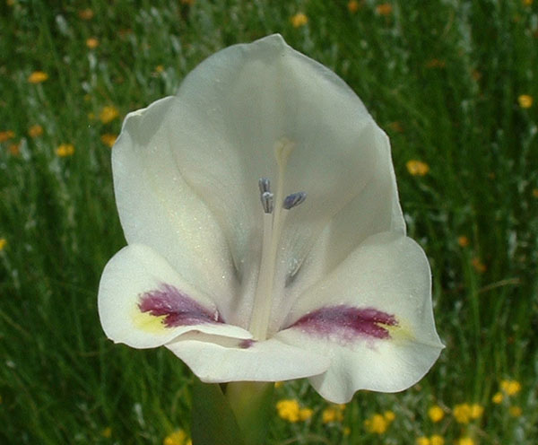 Gladiolus pappei Baker grows in marshes on sandstone slopes in the southwestern Cape. It flowers in spring. Height range: 20-35 cm. The first two photos show a plant that was grown from Silverhill seeds sown in September 2001 and first blooming in June 2003. Photos by Bob Rutemoeller and Mary Sue Ittner. The last photo was taken by Rachel Saunders.