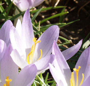 Crocus tommasinianus Herb. has lilac to purple flowers and is native to Croatia, Serbia, Bosnia, Montenegro, Bulgaria and Hungary where it grows in woods and shady hillsides and blooms in winter. Height range: 7-10 cm. The plants in the first three photos photographed by Kelly Irvin are naturalizing and growing well. The second is a close-up and the last a lighter colored clump. Photo 4 by Dell Sherk shows a sport that appeared in his garden and has extra petals, 8 or 9.