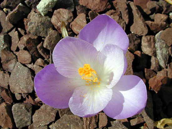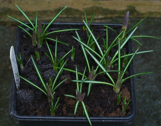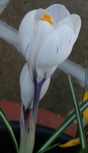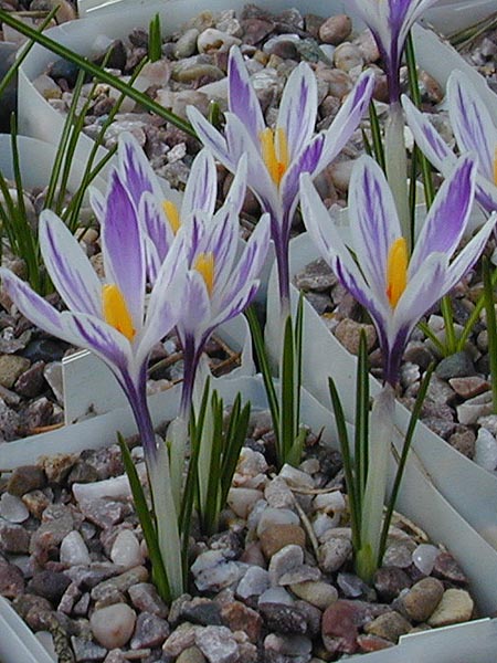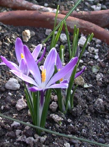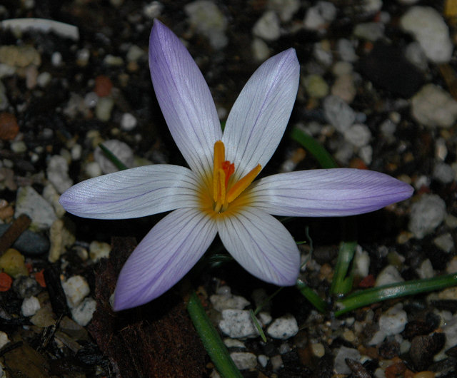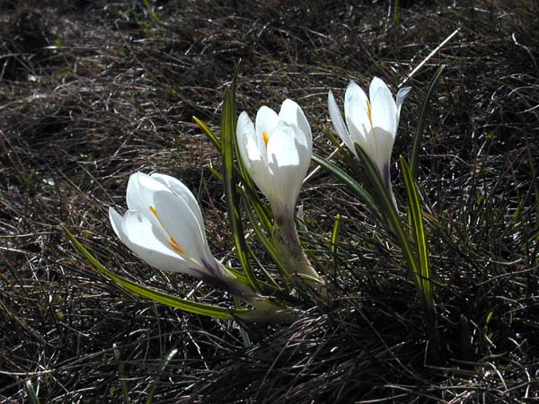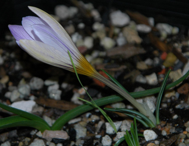 Crocus versicolor Ker-Gawler from southern France and northwestern Italy grows on stony and grassy places and in open woodland. Flowers are white, purple or lilac with a yellow throat and darker stripes on the outside. The outer segments are silver to buff. Bloom time is February-March. Height range: 10-15 cm. Photos 1-2 from Mary Sue Ittner taken January 2008 and photos 3-4 from Paige Woodward of a form descended from a collection in Provence that grows 5-8 cm (2-3.5"). She suggests this species is hardy to Zone 5.