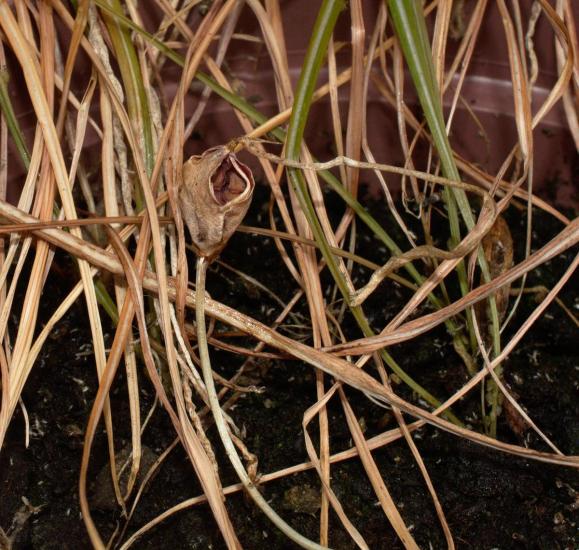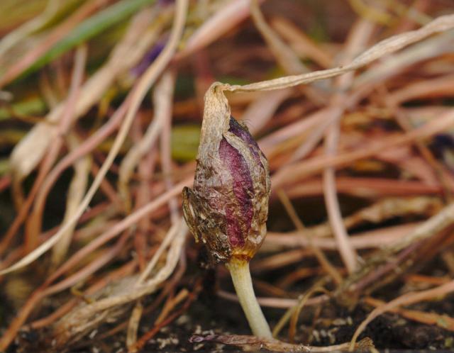 Crocus tommasinianus 'Barr's Purple'. Peter Barr founded the eponymous Covent Garden bulb and seed merchant in 1860 and was one of the first popularizers of Narcissus, becoming known as "the daffodil king". Photos by David Pilling include corms shown on a 10 mm grid. Photo 6 is of a seed pod at the end of May; note the bottom edge is at ground level and the total height of the pod is around 20 mm.
