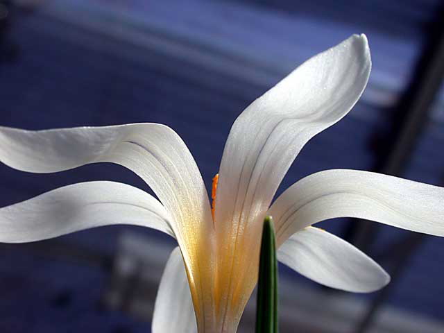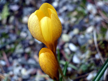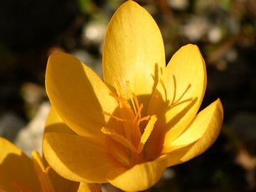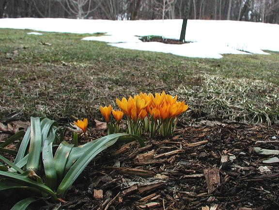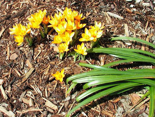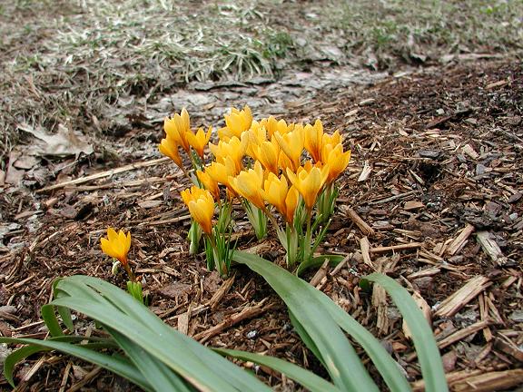 Crocus vitellinus Wahlenb. varies in flowering time from late autumn to early spring. It is native to Lebanon, Syria, and Turkey. Height: 9 cm. The first four photos were taken by Mark McDonough on March 22, 2003 who wrote that it was the very first bulb to bloom in his garden that year. The particular plants shown were purchased as bulbs from Paige Woodward's Pacific Rim Nursery and planted out in the fall. Just 2 days after 24" (60 cm) of hardened snow and ice receded on the warm south side of his house, this tiny species popped into bloom. The golden flowers have a pleasant sweet scent, and are brushed and speckled with brown on the exterior base of the tepals. Looking down on the flowers, they have a triangular countenance. The large glossy green leaves seen near the crocus bunch are Sternbergia lutea, which amazingly keeps its beautiful leaves even with an iceberg sitting on them all winter. The last two photos were taken by Paige Woodward.
