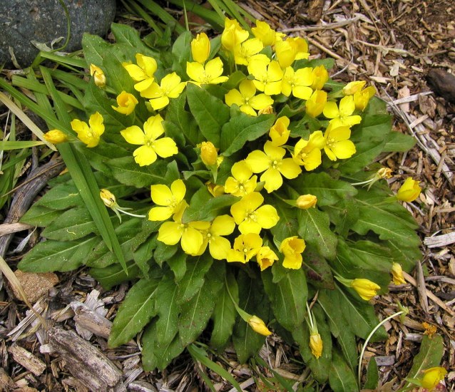 Taraxia ovata (Nutt. ex Torr. & A. Gray) Small, syn. Oenothera ovata Nutt. ex Torr. & A. Gra, Camissonia ovata (Nutt. ex Torr. & A. Gray) P.H. Raven, is found in grassy fields not far from the coast (less than 500 m), from Oregon to central California. It grows from a thick taproot which often branches. The basal leaves are in a rosette, ovate to elliptic with short erect hairs, and the flowers are bright yellow. The fruit is cylindric, swollen by seeds, papery. It flowers March to June. Height range: to about 18 cm. Photos taken by Mary Sue Ittner in Mendocino and Sonoma Counties, California and include a photo of the taproot. She doesn't usually seed seeds which are buried and distributed by ants.