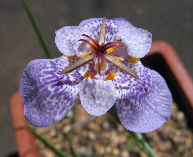 Tigridia Juss. is a genus of about 30 species mainly from Mexico and Guatemala in the Iridaceae family. They produce a succession of short lived flowers which are usually in bright colours. The rootstock is a tunicated bulb, found from 3 to 15 cm deep in the wild. Bulbs are never found to offset in the wild. Leaves are pleated in a broad fan. The best known species is Tigridia pavonia whose flowers are 10-15 cm (4 -6 inches) across in red, orange, yellow or white variously blotched in the centre. They commence growth in spring and generally die back during autumn. Many species are easy to grow in pots, but survive best if protected from rain in the winter. This genus was the subject of the topic of the week September 2003. An introduction was furnished by Alberto Castillo.