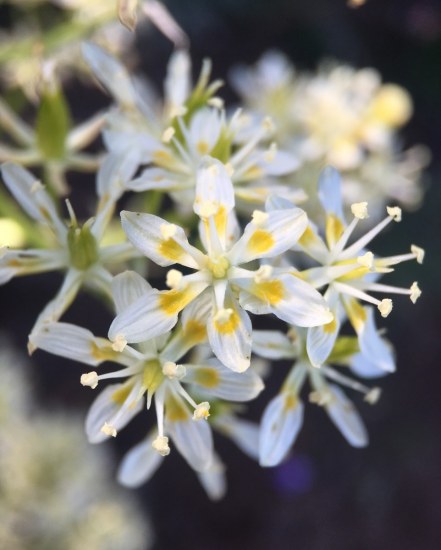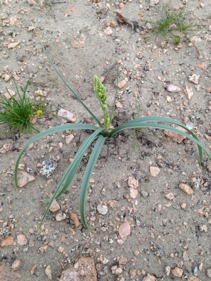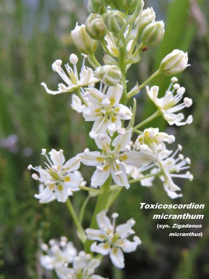 Toxicoscordion paniculatum (Nutt.) Rydb. (syn. Zigadenus paniculatus (Nutt.) S.Watson) has a wide distribution from California, Idaho, Nevada, Oregon and Washington in the west, northeast to Montana, and southeast to New Mexico. An identifying feature: the filaments are longer than the perianth. Height: to 2 ft. Grows in dry sagebrush scrubs and conifer forests, flowering from April to July. (Source: Flora of Oregon Vol.1: Pteridophytes, Gymnosperms, and Monocots, p.313)