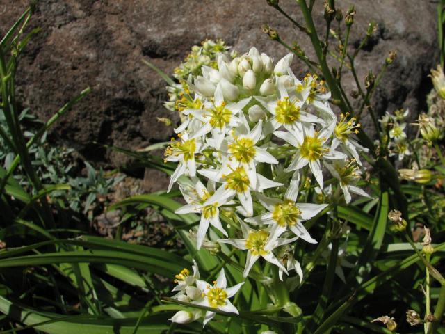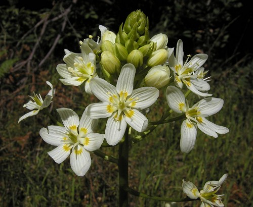 Toxicoscordion fremontii (Torrey) Rydberg (syn. Zigadenus fremontii (Torr.) Torr. ex S.Watson) is found in the California Floristic Province from southern Oregon south to Baja California. It grows in variable habitats, both coastal and inland, in grassland chaparral and mixed evergreen forests. It flowers from February to June. It is very variable in height with white showy flowers in open panicles. Height range: 40-90 cm. Photos 1 from Mary Sue Ittner and 2 Bob Rutemoeller give you an idea of how floriferous it can be and show a close-up of the flowers. Photo 3 shows the bulb on a 1 cm grid. Photos 4 & 5 from Mary Sue Ittner are habitat shots taken in northern California. Photo 4 shows a plant growing near the Pacific Ocean in Salt Point State Park on the Mendocino Sonoma Coast and photo 5 was taken in Mendocino County where they grow on the ridge in mixed evergreen forests.