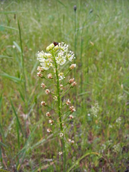 Toxicoscordion micranthum (Eastwood) A. Heller (syn. Zigadenus micranthus Eastw.) is a species with the common name "smallflower deathcamas". It is native to Southwestern Oregon and Northwestern California, sometimes on serpentine. It has creamy white flowers in a loose raceme and rounded yellow nectaries at the base of each tepal. The tepals are often slightly incurved. The leaves are thin, less than one quarter inch wide and keeled, shorter than the inflorescence. Basal leaves are few, opposite at the base with smaller leaves alternately whorled on the lower half of the stem. Flowers are borne low on the scape towards the ground, the stem elongating to as much as fifteen inches, though often less. Grows on dry slopes and flats. Height range: 10-70 cm. Photos by Travis Owen, growing in close vicinity to Brodiaea elegans and Triteleia hyacinthina.