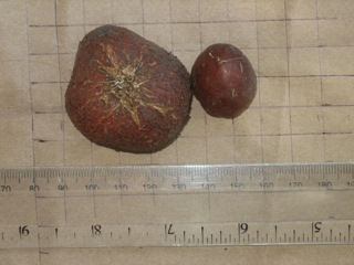 Tropaeolum brachyceras Hook. & Arn. is another half hardy native of Chile, with yellow flowers with purplish markings up to 25 mm (1 inch). This species may stay dormant some years and it is not clear what triggers it to break dormancy. The stems are very tiny and fragile when they first come up and if they are broken or the plant does not get water then, that may be the end of the growth for that season. It is a climber and will need support for the thin stems. Photo 1 was taken by Bill Dijk. Photo 2 was taken by Nhu Nguyen and photo 3 was taken by Jane McGary. The last 3 were taken by Mary Sue Ittner including a tuber on a 1 cm grid.