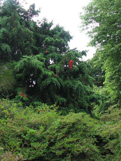 Tropaeolum speciosum Poepp. & Endl. is native to central Chile. It is a summer grower and has quite a large stature (see photo below). The name "Flame Creeper" is quite appropriate for this species because of the brilliant red inflorescence that can hold dozens of flowers. It is difficult to establish, but once established, it is very hardy and in Scotland it can be found in abandoned gardens flowering prolifically. On the other hand, the tubers are quite sensitive to hot temperatures, making them likely to fail due to early induced summer dormancy in continental climates. Photos 1-5 were taken in August 2010 by Nhu Nguyen at the Royal Botanic Garden at Edinburgh, Scotland. Photo 6 by Caroline Langensiepen.