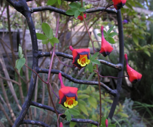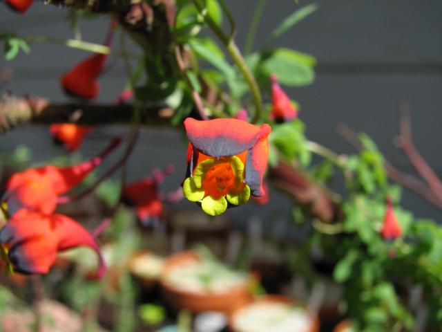 This species is long blooming and a favorite winter blooming plant in Mary Sue Ittner's Northern California garden. She grows it in a deep container nested in another pot in the ground and provides it with a trellis or fence to grow on. The initial shoots are very fragile so it can be difficult to get them started growing on the trellis so for back up she also has a pot in her greenhouse where she can protect it from the elements. The first two photos by Bob Rutemoeller show the first blooms and then later when there were many more. Photos 3 and 4 from Mary Sue Ittner show species Tropaeolum brachyceras where the two are intertwined in the greenhouse. The tubers look alike so after they initially appeared together, they have remained together. Photo 3 was taken by Bill Dijk. Photo 4 was taken by Jane McGary of a plant that escaped the bulb house. Plants that can grow in the ground can become spectacular specimens.