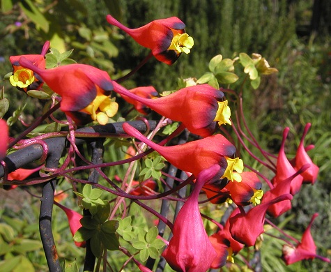 Tropaeolum pentaphyllumLam. is a climbing species native from Brazil to Argentina that produces masses of pink flowers, tipped with green, followed by dark purple fruit. It is commonly called 'Ladies legs' as the flowers resemble pink legs with green shoes. The name pentaphyllum means 'five-leaved'. Photos 1 and 2 by Bill Dijk. Photo 3 of seed by David Pilling.